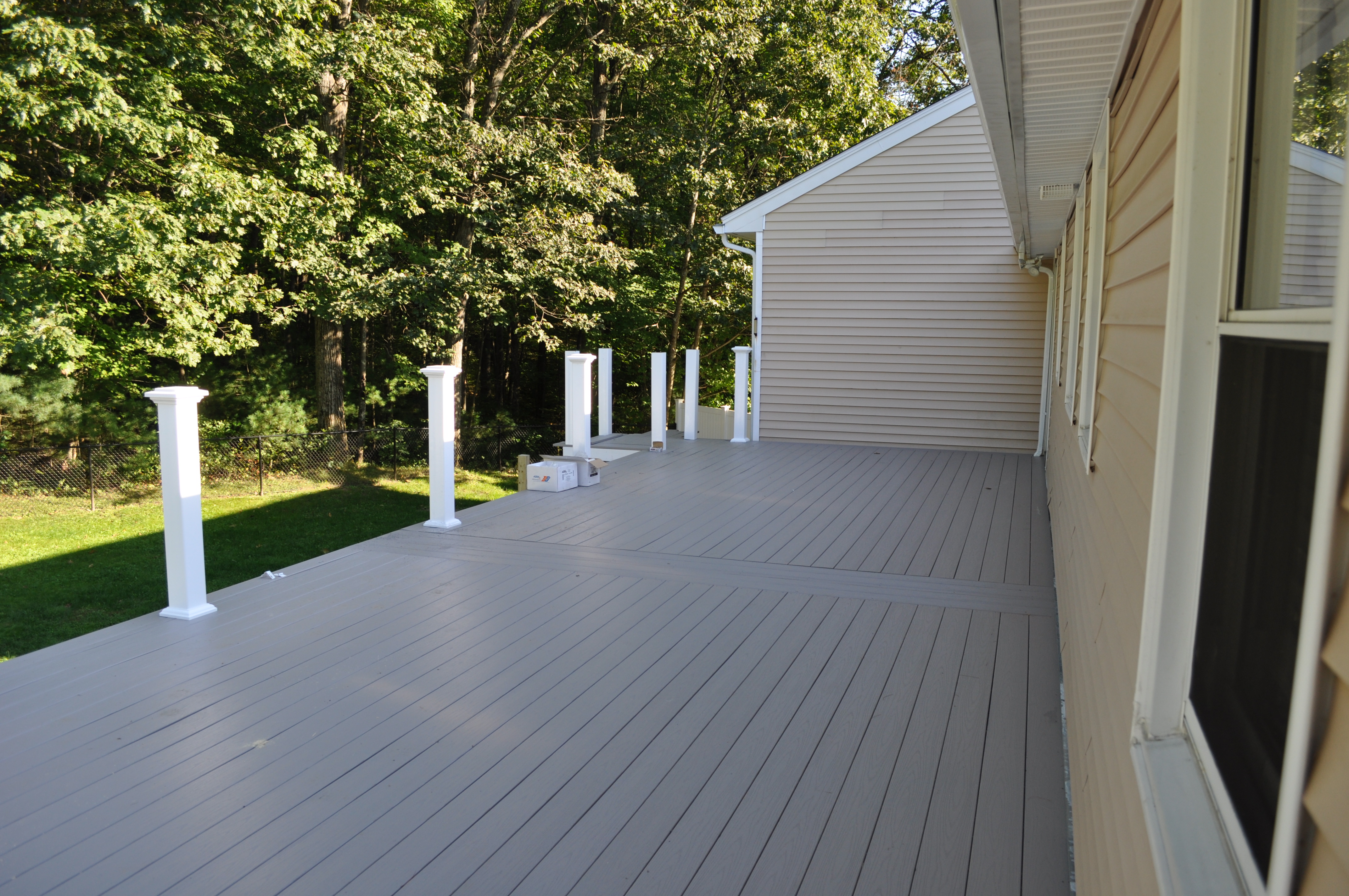 The decking looks fantastic on this 40×14 deck, it is actually a 43X14 deck !! We used boards 20’ in length and put filler boards in the middle to break up the longitude of the design. The posts are an Azek, maintenance free product, as well as the decking. The posts have a sleeve that slips over the pressure treated framed post to display the wow factor of the entire Azek deck. Stayed tuned for the railings and stairs and we will be finished with this project.