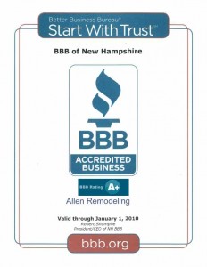 The Better Business Bureau of Concord NH provides great articles regarding choosing the right General Contractor for your building projects.  Many times when Spring and warm weather arrives unqualified or undesirable Contractors will advertise their services and provide great deals which often turn out to be scams.  Read below for tips on choosing the right Contractor.  Allen Remodeling has an A+ rating with the BBB, we have won the Souhegan Choice Awards for 4 years in a row and we are part of the Souhegan Chamber of Commerce in Amherst NH.  The Souhegan Valley serves the following Towns, Bedford NH, Milford NH, Merrimack MH, Hollis NH, Mont Vernon NH, Brookline, NH, Mason NM, Wilton NH, Lyndeborough NH, Peterborough NH, and Temple NH.