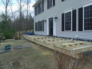 The framing is going nicely at the farmers porch in Manchester NH.  As you can see the framing for the deck includes the ledger board and the girder board.  The roof is a hip roof style that accents the current roof of the home.  The Homeowner has chosen Azek Decking for the deck and stairs in the premium color Kona.  When this front porch is complete it will be a nice addition to the home.