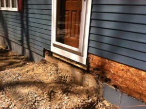 We started a front porch/ farmer’s porch project in Bedford NH this past week. Once we removed the cement steps there was much rot in the sheathing and clapboards. We discussed the issue with the Homeowner and wrote up a change order to repair the rot. Now that the rot repairs are completed we can start framing for the front porch, it did not make any sense to build a new front porch ontop of rotted plywood. Stayed tuned for more pictures of the framing, the deck boards being installed and the railings (we like Azek products).